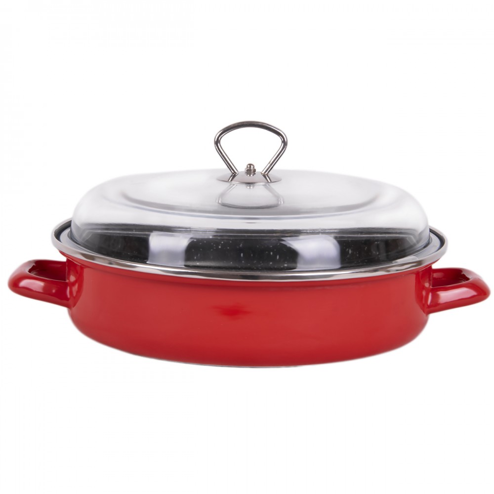 Visokokvalitetna izdržljiva čelična tepsija za pečenje. Emajlirane ručke i spoljašnjost. Visokokvalitetni poklopac od borosilikatnog stakla sa dugmetom od nerđajućeg čelika. Unutrašnji premaz od kamena protiv lepljenja. Koristite u rerni ili na šporetu. Pogodno za širok spektar izvora grejanja: gas, halogeni, električni, staklokeramički i indukcioni. Mašina za pranje sudova bezbedno.Visina: 7,0 cm