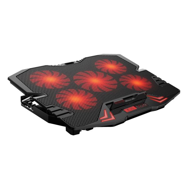 Cooler Omega OMNCP5R, 5 ventilatora, led crveno osvetljenje, podešavanje brzine I vrste hlađenja, tri moda hlađenja, podešavanje nagiba, 2 USB porta, za lap topove od 9″-17″