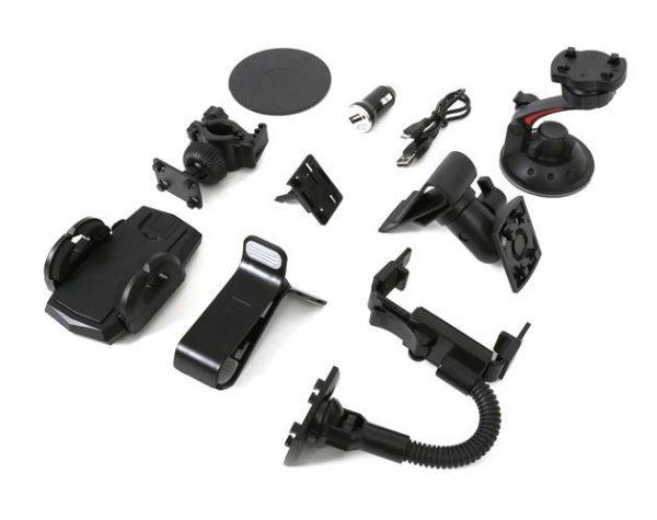 Automobilski set držača I punjača za telefone OUCH10 OMEGA : držač za telefone do maksimalne širine od 93mm, držač/štipaljka za telefone maksimalne širine do 125mm, nosač telefona za senilo iznad vozača, nosač držača za montažu na šoferšajbnu, fleksibilni nosač držača za montažu na retrovizor, nosač držača za montažu na ventilacioni otvor, lepljiva podloga za komandnu tablu, USB punjač od 1A, micro USB kabal za punjenje, držač telefona za bicik