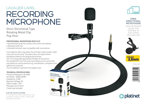Mikrofon Platinet PMLLCB, mikrofon bez stalka sa štipaljkom za kačenje na odeću, konektor 3.5mm, dužina kabla 1.5m