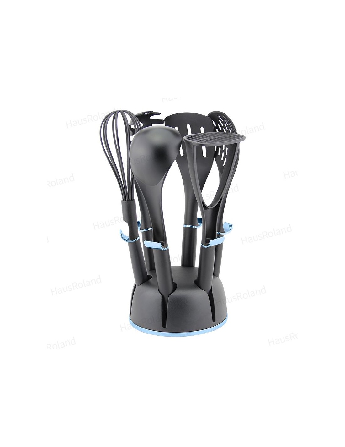 Set kuhinjski HausRoland A-910 set uključuje: kutlača Presa za krompir Rezana kašika Rešetkasta lopatica Kašika za špagete Razbijač jaja Plastični stalak Materijal: najlon“